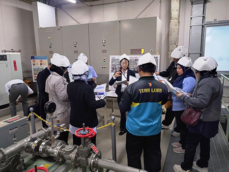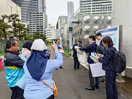 The SWMA delegation arrived at the Shibaura Water Reclamation Center (SWRC) at 2:00 PM, where they received an explanation from METAWATER Co., Ltd. staff below about the retreatment process that allows a portion of the conventionally treated sewage water to be reused as toilet flush water for nearby buildings.
