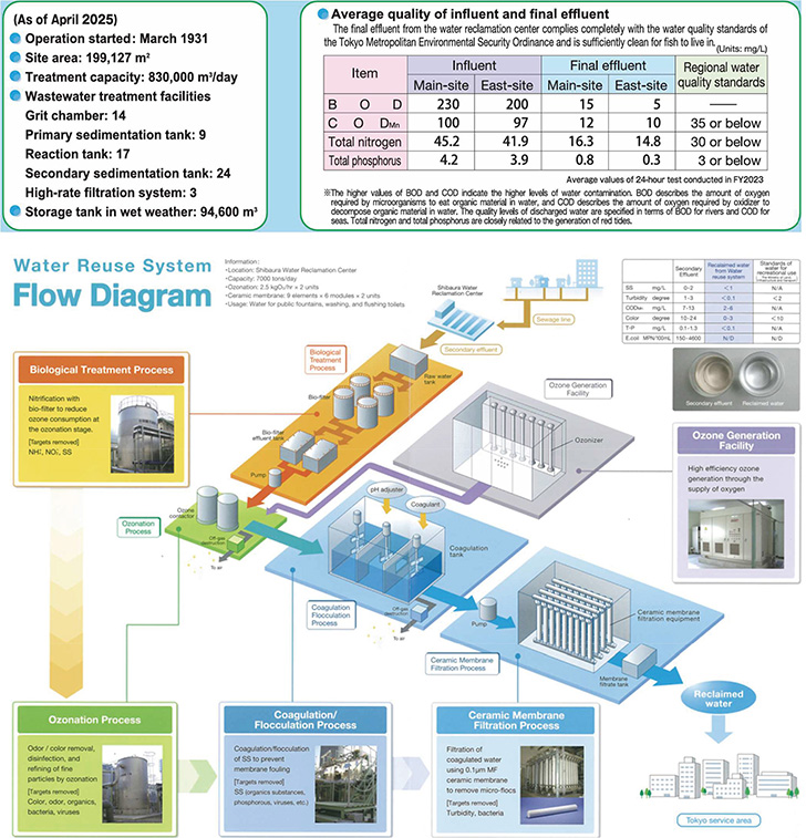 Treated water (830,000 m³/day) is discharged into Tokyo Bay, but a portion (7,000 m³/day) is purified through biofilm treatment, ozonation, and ceramic filtration processes and supplied to nearby buildings for toilet flushing. The resulting sludge is sent via a pressurized water pipe to the Nanbu Sludge Plant for incineration.